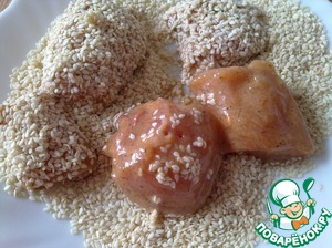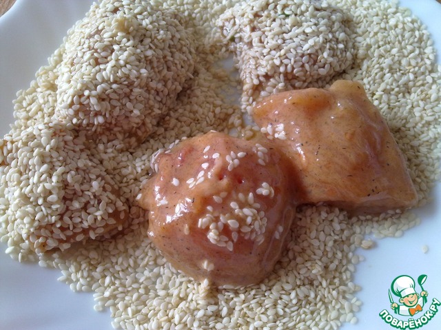 Высыпаем семена кунжута на тарелку и обваливаем в них маринованные кусочки куриного филе.