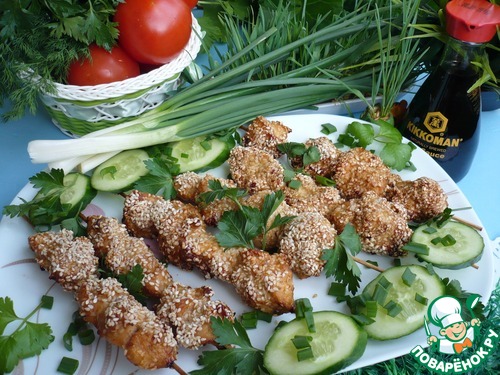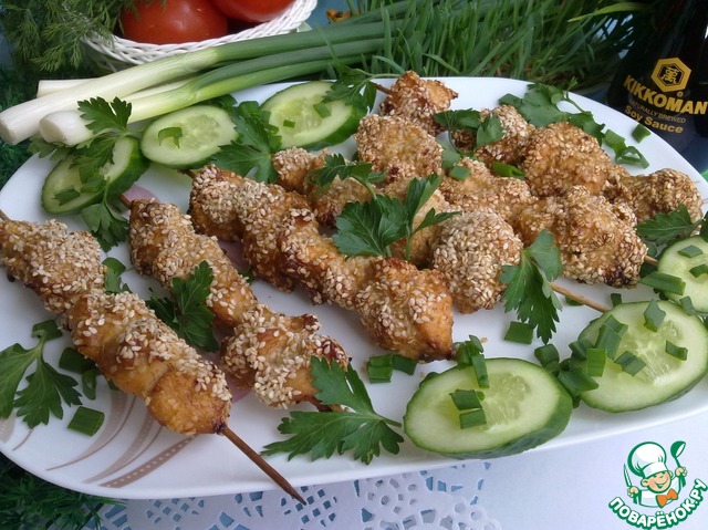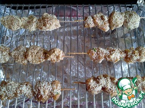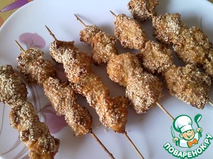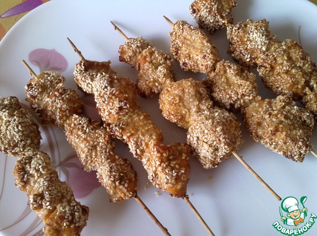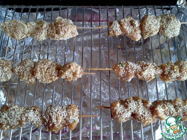 Нанизываем куриные кусочки мяса на шпажки и посыпаем оставшимся кунжутом.