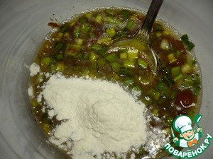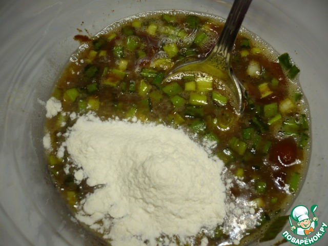 Засыпаем струйкой муку и перемешиваем маринад до однородного состояния.