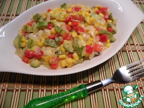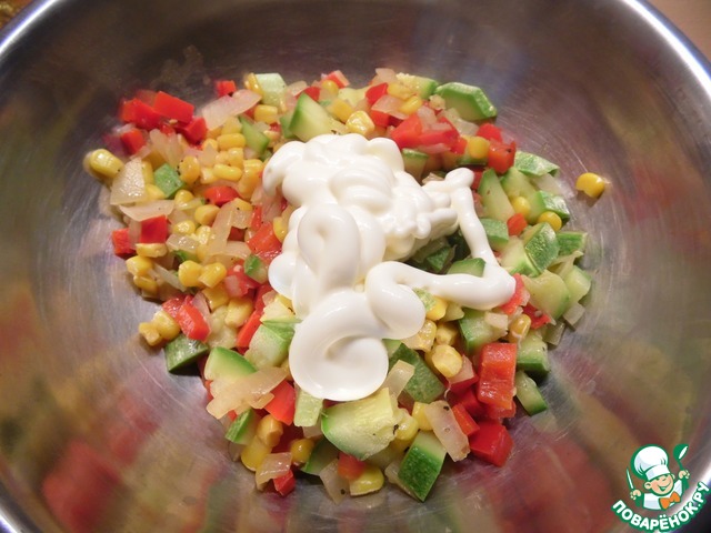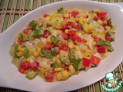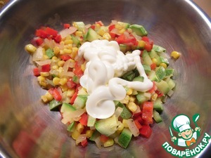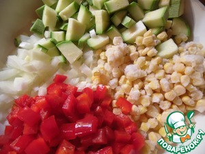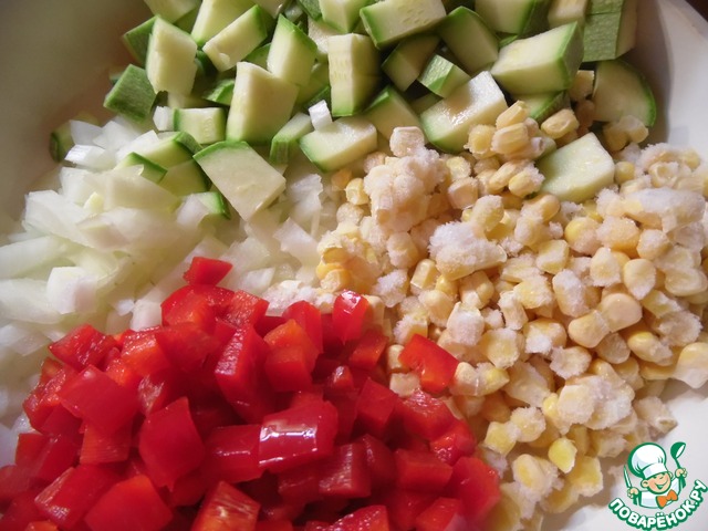 Перец нарезать небольшими кусочками, цуккини - небольшими кубиками, лук мелко нашинковать. Добавить кукурузу. Овощи обжарить на растительном масле 9-10 минут. Посолить, поперчить, слегка остудить.