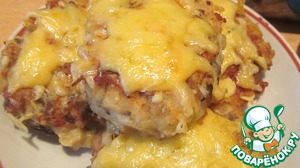 6. Вторую часть риса, баклажан, фарша смешать, добавить яйцо, соль, перец. Обжарить тефтели. Выложить на противень, посыпать тертым сыром