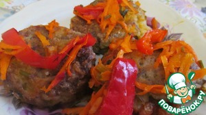 7. Для постных тефтелей обжарить морковку, красный болгарский перец, лук, добавить томат. Перед тем как поставить в духовку залить подливой.