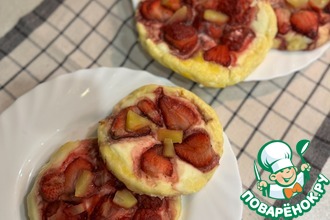 Творог соединить с разрыхлителем, ванилью и манно-сметанной смесью и взбить до состояния крема. Яйца взбить с сахаром, пока объем не увеличится в 2-3 раза.