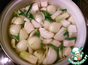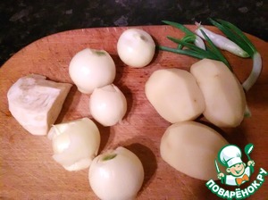 Чистим картофель, лук и сельдерей. У меня лук начал прорастать. Оставим и зеленые хвостики