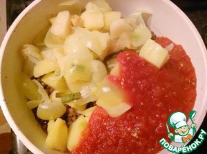 Овощи также сварились. Добавляем их к чечевице (бульон не выливаем). Также добавляем сок томатный (у меня домашнего приготовления), соль, тимьян, перец и оливковое масло