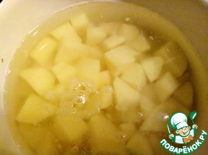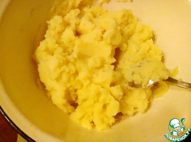 Когда картофель сварился, выливаем всю жидкость, а картофель давим в пюре. Солим по вкусу и оставляем чтоб остыл до комнатной температуры