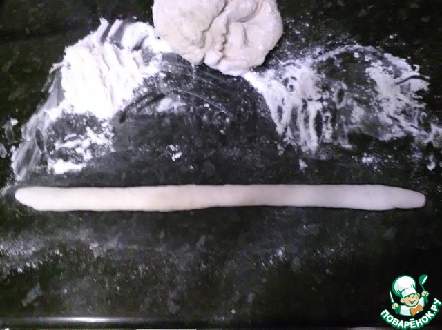 Отрываем от него по кусочку и раскатываем вот такие колбаски, толщиной примерно 2 см.