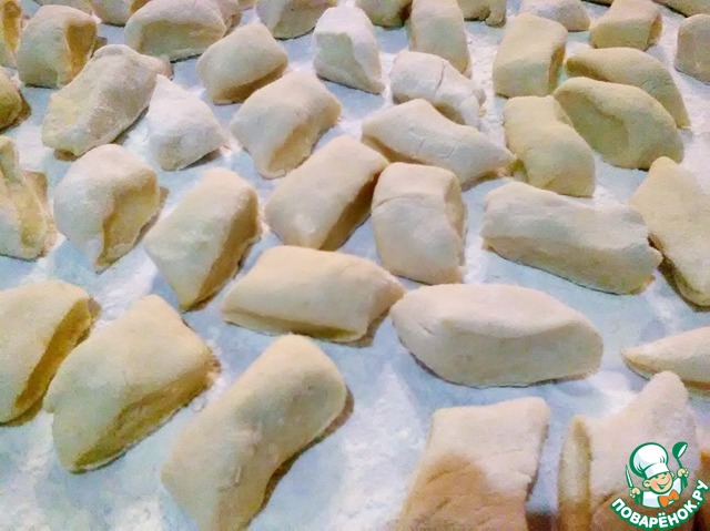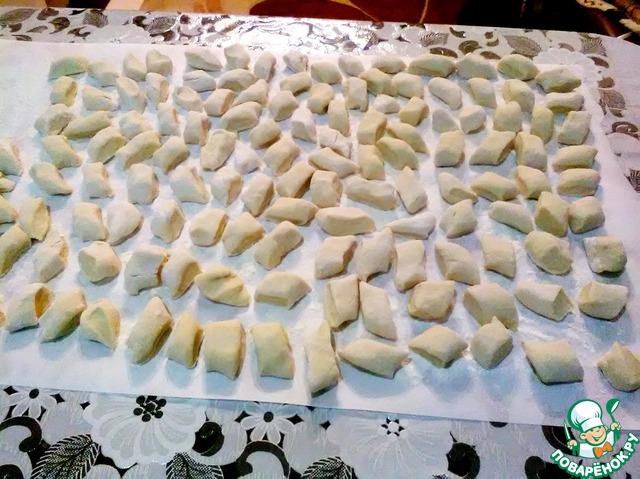 Наискосок нарезаем их и складываем на припудренный мукой пергамент.