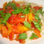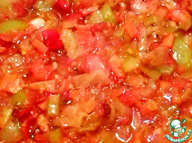 Когда лук и морковь размягчаться, добавляем к ним перец и накрываем крышкой. Через 5 минут, добавляем томатный сок и помешиваем до тех пор пока масса не загустеет. Солим, добавляем специи и выключаем плиту. Овощи должны получиться полу готовыми.