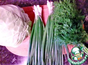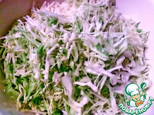 • Вернемся к начинке. Отжимаем сок из капусты и удаляем его. Капусту смешиваем с зеленью. Пробуем на соль. Добавляем черный перец.