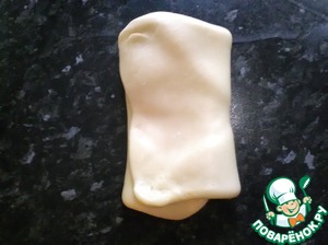 • Пришло время заняться тестом. Выкладываем его на стол. Не надо муки. тесто масляное и не прилипает ни к рукам ни к столу.