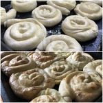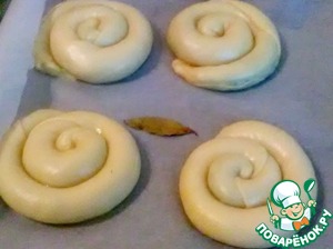 • Делаем точно такие же "улитки". В противень с постными плациндами я положил лаврушку, чтоб не перепутать))). Отправляем оба противня в разогретую духовку до 200 градусов на 1 час. У кого духовка печет неравномерно верхний и нижний противень, следим, меняем местами.