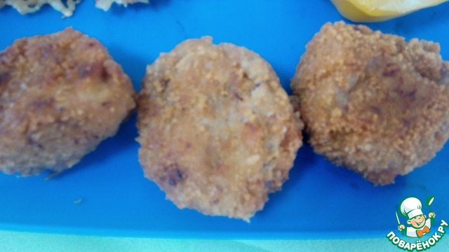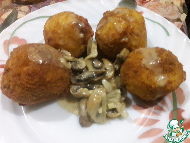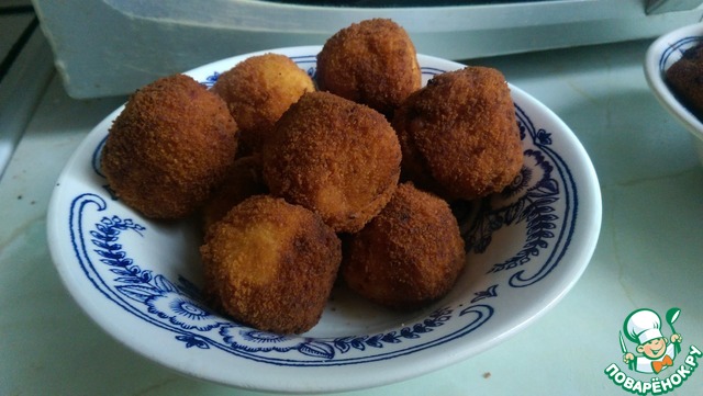 Кстати, поделюсь нюансом- когда сформировала шарики,а я их делала по три по четыре,пока одна партия жарится, ложила на доску и так они охлаждались немного и вот именно те,что раньше сделала и которые больше остыли, легче опускать в яйцо и сухари,и отправлять жариться)