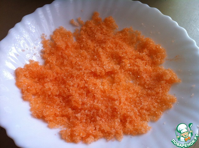 Натереть на мелкой терке свежую морковь. Из части через марлю отжать сок. Добавлять в сахар аккуратно, по капле (чтоб сахар не растаял), вмешивая сок пальцами. Когда цвет устроит, отставить тарелку с сахаром просохнуть на 1-2 дня. Время от времени перемешивать. -