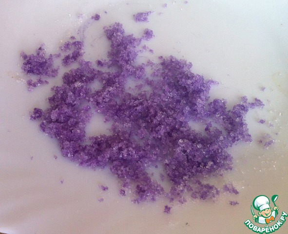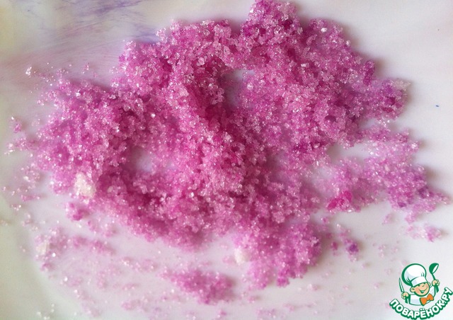 В блендере измельчить краснокочанную капусту. Отжать сок через марлю, разделить на 4 части. Чистый сок, добавленный по капле, красит сахар в фиолетовый цвет.