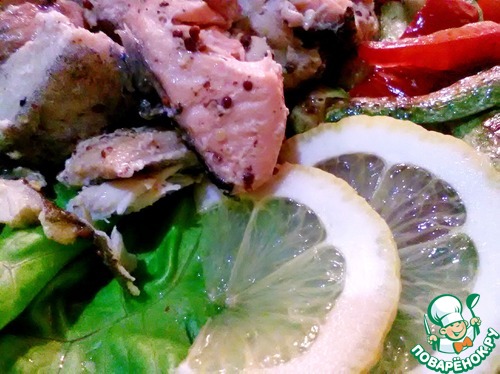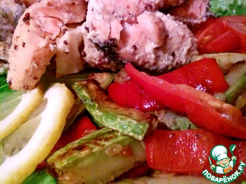 За 20 минут до окончания запекания рыбы, жарим овощи. Выкладываем их в разогретую сковороду с маслом и обжариваем помешивая, на сильном огне.
