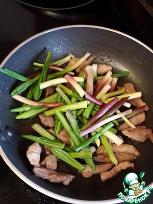 Нарежьте свинину небольшими кусочками, раскалите в совороде масло и обжарьте её быстро (5-7 минут), влейте соевый соус "Киккоман", перемешайте