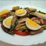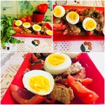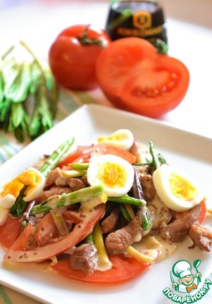 Смешайте нарезанный помидор со свининой и черемшой, полейте заправкой, сверху положите кружочки вареного яйца.
