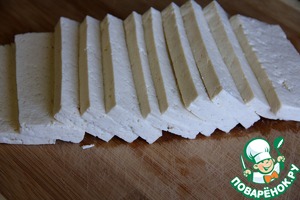 • Тофу насухо вытираем бумажным полотенцем и нарзаем на кусочки примерно 0.5см толщиной. Посыпаем одну сторону специями ( по вашему вкусу, у меня смесь перцев ).