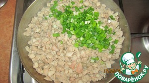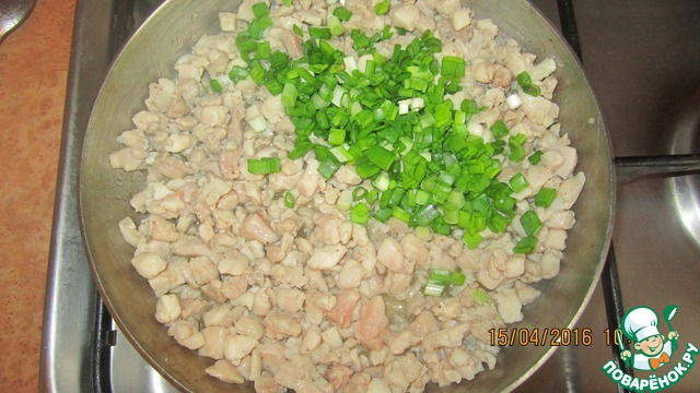 Далее растопить сливочное масло на сковороде и немного потушить (не жарить) в нем мясо. Мясо посолить, поперчить по вкусу. Пока мясо горячее, добавить мелко нарезанный зеленый лук.