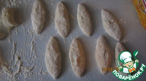 Раскатываем тесто и делаем из него ровненькую колбаску, разрезаем на 20 одинаковых частей.