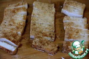 Тофу насухо вытираем бумажным полотенцем и нарзаем на кусочки примерно 0.5см толщиной. Посыпаем одну сторону специями ( по вашему вкусу, у меня смесь перцев ).
