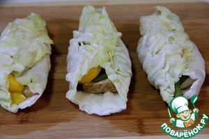Капустные листья отделяем от качана. Если они очень упругие, то положите их на 2 минуты в кипящюю воду, затем промойте холодной водой. У меня листья были не очень упругие и я их использовала сразу, сырыми.