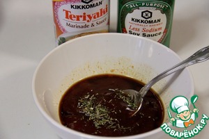 Для соуса смешиваем соевый соус, терияки соус, рисовый уксус, томатную пасту, растительное масло и специи ( у меня смесь прованских трав).