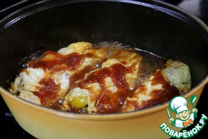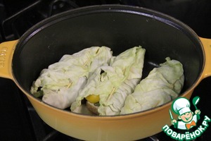 Наливаем немного воды (что бы доходило до половины голубцов) и поливаем соусом. Накрываем крышкой, доводим до кипения и готовим 20 минут на среднем огне.