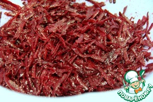 Свеклу (сырую) натераем на терке, добавляем растительное масло и перемешиваем. Оставляем немного постаять. Мы это делаем для того, что бы она не сильно окрашивала в дальнейшем остальные овощи.
