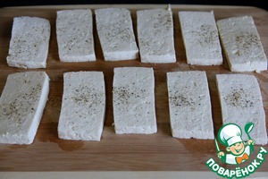 Тофу насухо вытираем бумажным полотенцем и нарзаем на кусочки примерно 0.5см толщиной. Посыпаем одну сторону специями ( по вашему вкусу, у меня смесь перцев ).