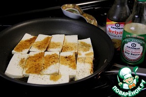 На сковороду наливаем кунжутное масло и кладем кусочки тофу, стороной со специями вниз. Сверху посыпаем теми же специями и поливаем соусом терияки и соевым соусом. Я использовала соевый соус и терияки соус ТМ "Киккоман". Я поливаю соусом "на глаз", его не должно быть много.
