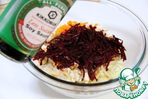 Добавляем свеклу, брынзу, и изюм. Для заправки используем растительное масло, соевый соус и рисовый уксус.