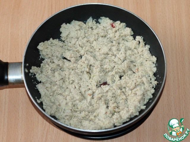 • 8. Затем смешиваем мясной фарш с 1/2 частью постной основы, 1-2 минуты прогреваем и выкладываем в блюдо.
