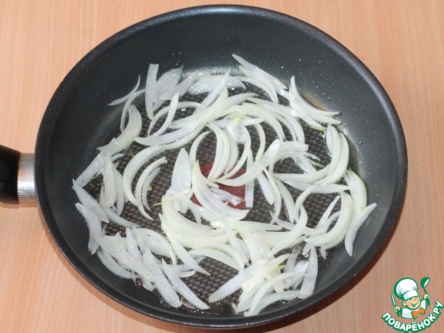 • 2. Лук порезать полукольцами и обжарить на разогретом масле (1 ст. л.) до прозрачности.