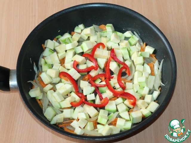 • 4. К овощам кладем очищенный от шкурки и порезанный кубиками кабачок и порезанный соломкой сладкий перец. Добавляем 1-2 ст. л. масла, соль, перец молотый, перемешиваем, накрываем крышкой и готовим до готовности кабачка.