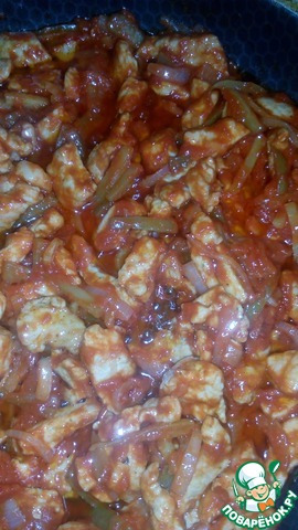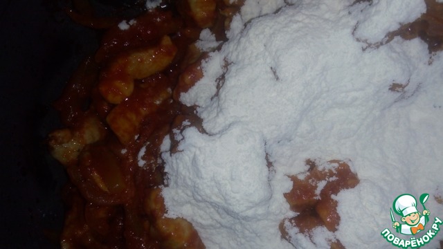 Теперь добавляете томатную пасту и еще минуты три томите на малом огне
