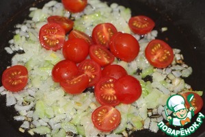 Помидоры черри порезать пополам. Чеснок раздавить плоской стороной ножа и мелко порубить. Помидоры и чеснок добавить к содержимому сковороды. Готовить 1 минуту, помидорки следует лишь прогреть.
