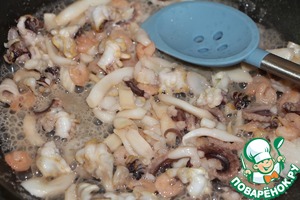 Ко второй части основы добавить горячие морепродукты, перемешать.
