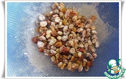 Изюм промываем и минут на 15 замачиваем в воде. Потом воду сливаем, изюм обсушиваем и перемешиваем с мукой (1 ч. л.), чтобы в тесте он распределился более равномерно.