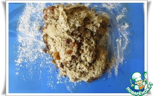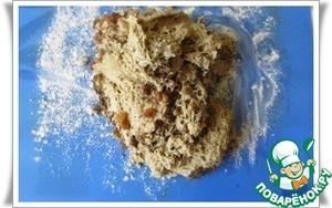 Подошедшее тесто вываливаем на присыпанную мукой поверхность, выкладываем сверху изюм и тмин.