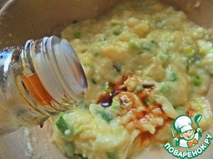 И муку с разрыхлителем. Перемешиваем. Кому мало соевого соуса, досаливаем.