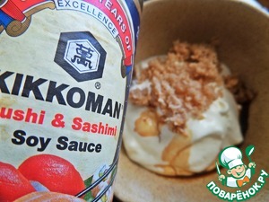 Для соуса смешиваем сметану, тёртый хрен и соевый соус.