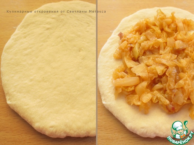 Для начинки нарезать капусту, лук очистить, нарезать. Тушить в нагретой сковороде на оливковом масле до тех пор, пока капуста не станет мягкой. Добавить 2 ст. л. томатной пасты, посолить, поперчить по вкусу. -