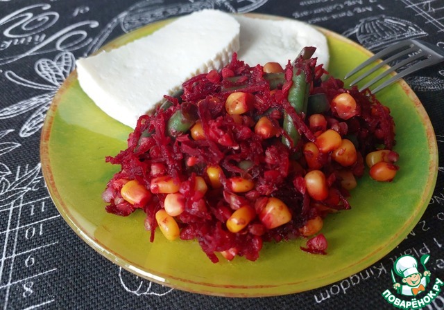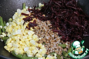 Добавляем гречку, свеклу и зерна кукурузы к зеленой фасоли. Так же добавляем специи по вашему вкусу ( я использовала смесь прованских трав, порошок корня имбиря, мускатного ореха и перца чили по 1/2 ч. л.) и соевый соус.