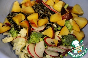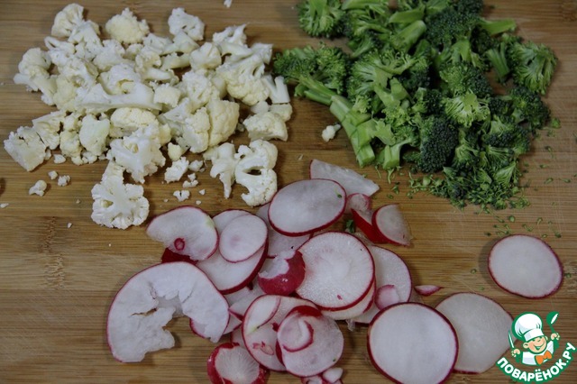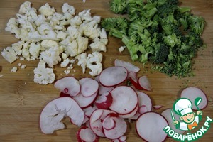 Цветную капусту и брокколи мелко режем. Редис нарезаем на круги.