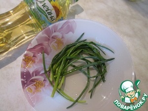 Зеленый лук промыть, обсушить, сбрызнуть лимонным соком и растительным маслом.