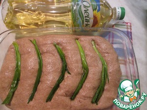 Распределить тесто в прямоугольной форме, смазать сверху растительным маслом и разложить сверху подготовленный лук, слегка вдавливая его в тесто. Слишком длинные перышки обрывайте. Накрыть хлеб салфеткой и оставить в теплом месте на 45 минут.
