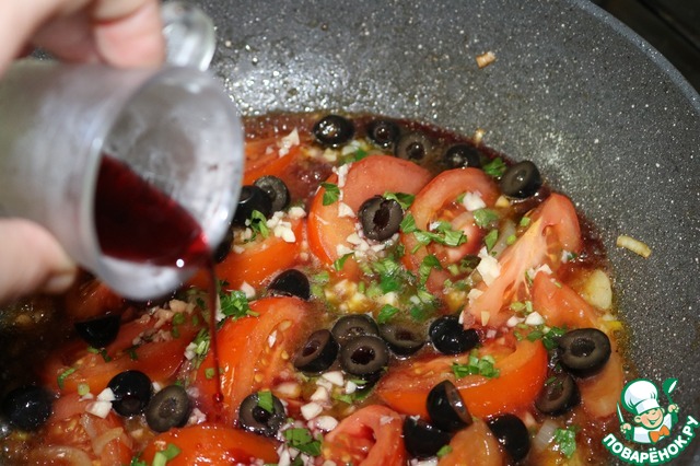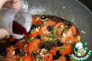 И, добавляем вино. Всё хорошо перемешаем, добавим соль, немного сахара и нужно, чтобы немного покипело...