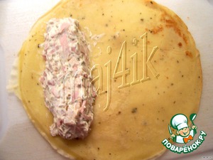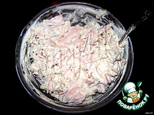 Ветчину нарезать полосочками, добавить вторую половину сливочного сыра и тоже перемешать.